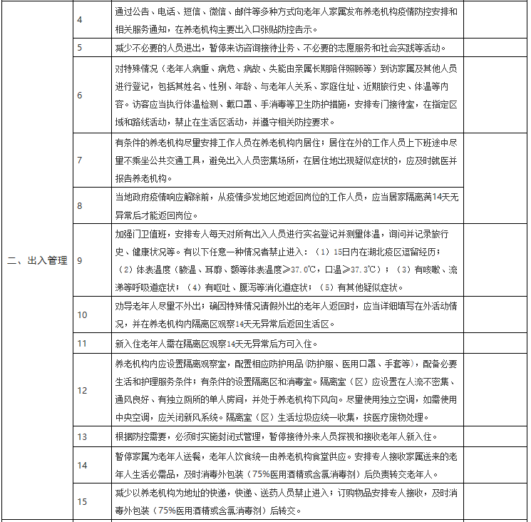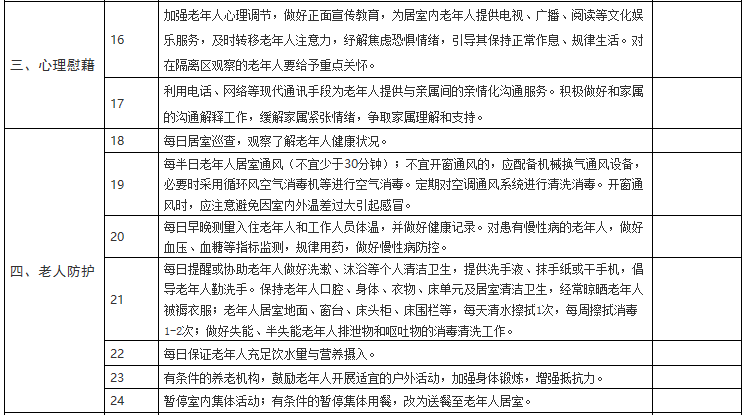通知强调,各地要把疫情防控工作作为当前最重要的工作来抓,纳入2020年全国养老院服务质量建设专项行动内容,将疫情防控要求落实到每家养老机构,切实增强风险意识,确保部署到位、责任到人。在加强相关防控的同时,高度重视加强老年人和工作人员心理调节,纾解焦虑恐惧情绪。各地可结合实际补充完善相关内容,并注意总结有效经验做法,落实中遇到的问题和建议及时报民政部养老服务司,以便进一步更新完善。