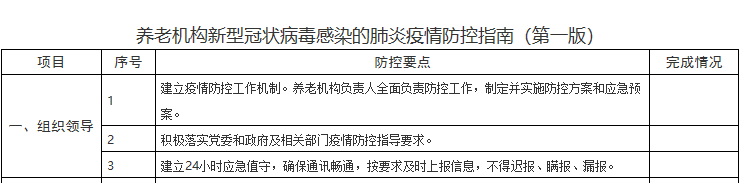 为贯彻落实习近平总书记关于防控新型冠状病毒感染肺炎疫情的重要指示精神和党中央、国务院决策部署,根据应对新型冠状病毒感染肺炎疫情联防联控工作要求和民政部前期部署安排,结合相关疾控指导及各地有效做法,民政部近日发出《关于印发<养老机构新型冠状病毒感染的肺炎疫情防控指南(第一版)>的紧急通知》 ,要求各地全力做好养老机构新型冠状病毒感染的肺炎疫情防控工作。社区日间照料服务机构等老年人服务场所可参照执行。