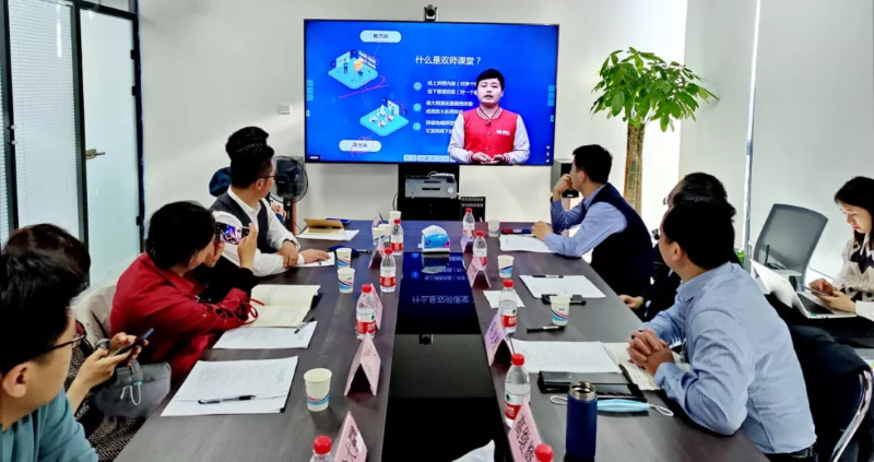 授渔计划基金秘书长高继辉带领与会人员参观了“双师课堂”演播教室、智慧教室模拟场景,现场连线技术人员进行互动授课演示。