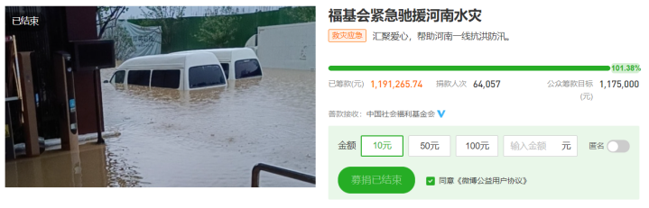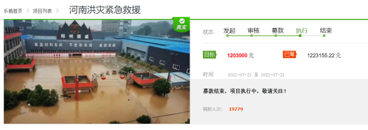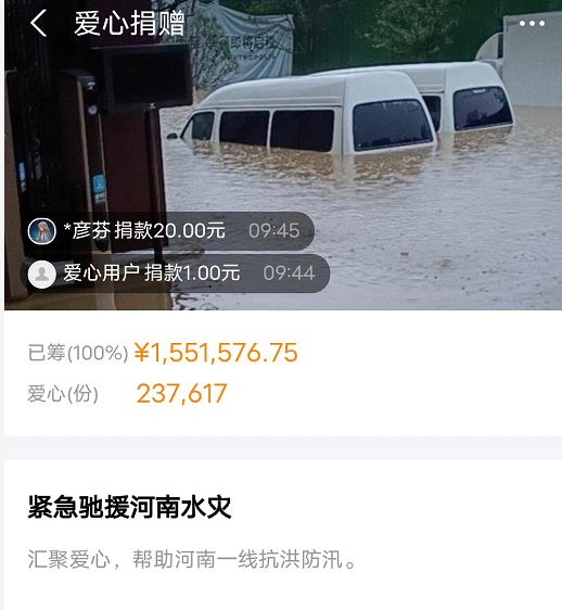 洪灾无情,人有情!洪灾当前,中国社会福利基金会联合腾讯公益、新浪微公益、支付宝公益发起分别发起河南洪灾紧急救援项目,汇集32万人次爱心,募集善款 3965848.68元。另外,基金会收到张艺兴工作室银行转账1070000元,河南洪灾累计募集已达5035848.68元。