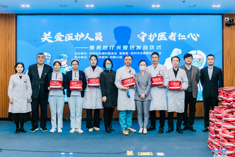 在“医疗关爱包”发放活动的现场,中国社会福利基金会关爱基金邱中萍主任、爱美客技术发展股份有限公司政府事务首席代表杨明女士、河南省卫健委二级巡视员张健锋等向医护人员代表发放了“关爱包”。郑州市志愿服务联合会、郑州人民医院、和勤公益等机构相关负责人参加了发放活动。