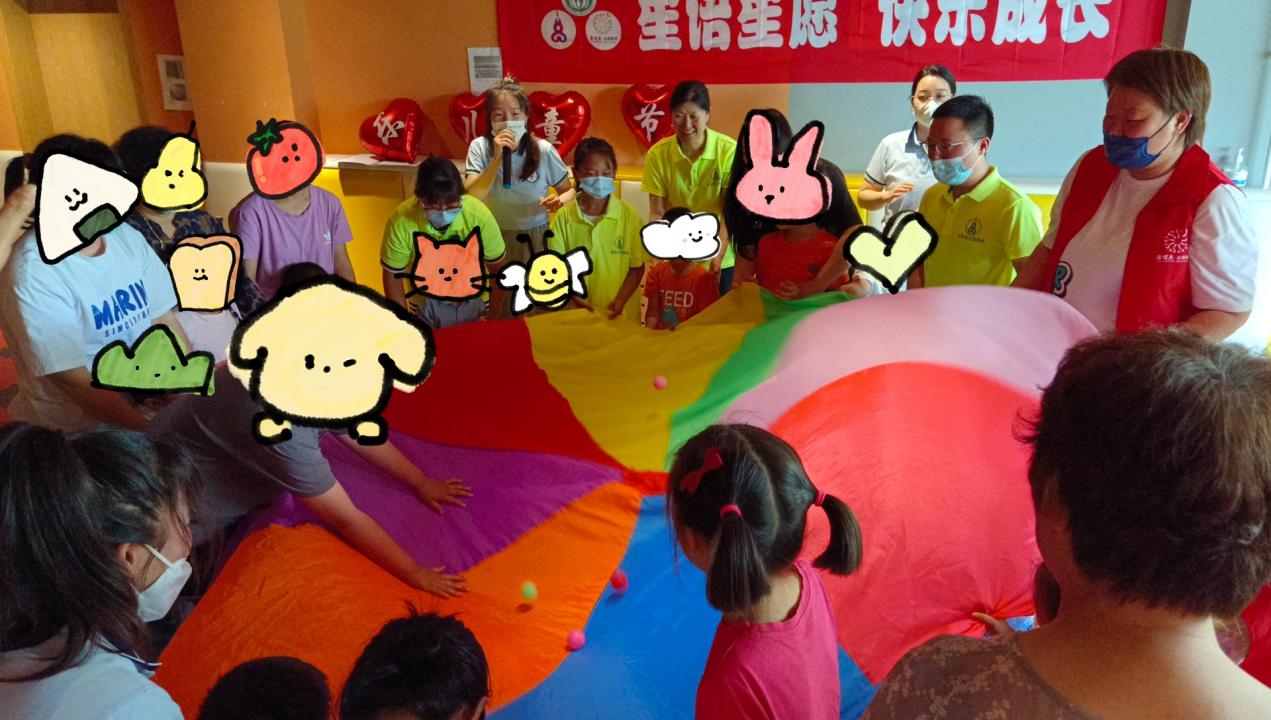 精彩的表演,赢得了在场所有人的掌声。接下来在老师的指导下,志愿者们与小朋友们一起做《彩虹伞》互动游戏,原本拘束的志愿者,在孩子们热情的带动下,也逐渐放开和孩子们打成一片。随着音乐的响起,我们听从老师的口令,时而转圈,时而停止,时而抖动的彩球满天飞。大家没觉得是在陪孩子们做游戏,反而感觉回到了我们小时候的童年,是那么的美好!