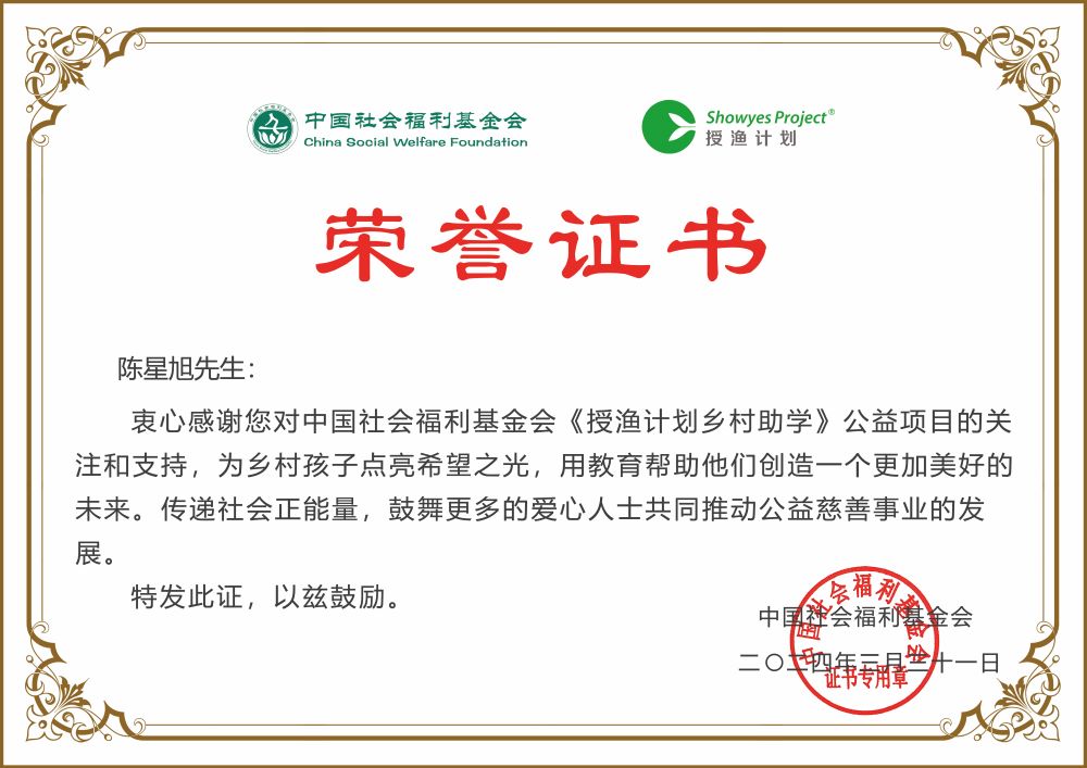 陈星旭先生向中国社会福利基金会授渔计划捐赠