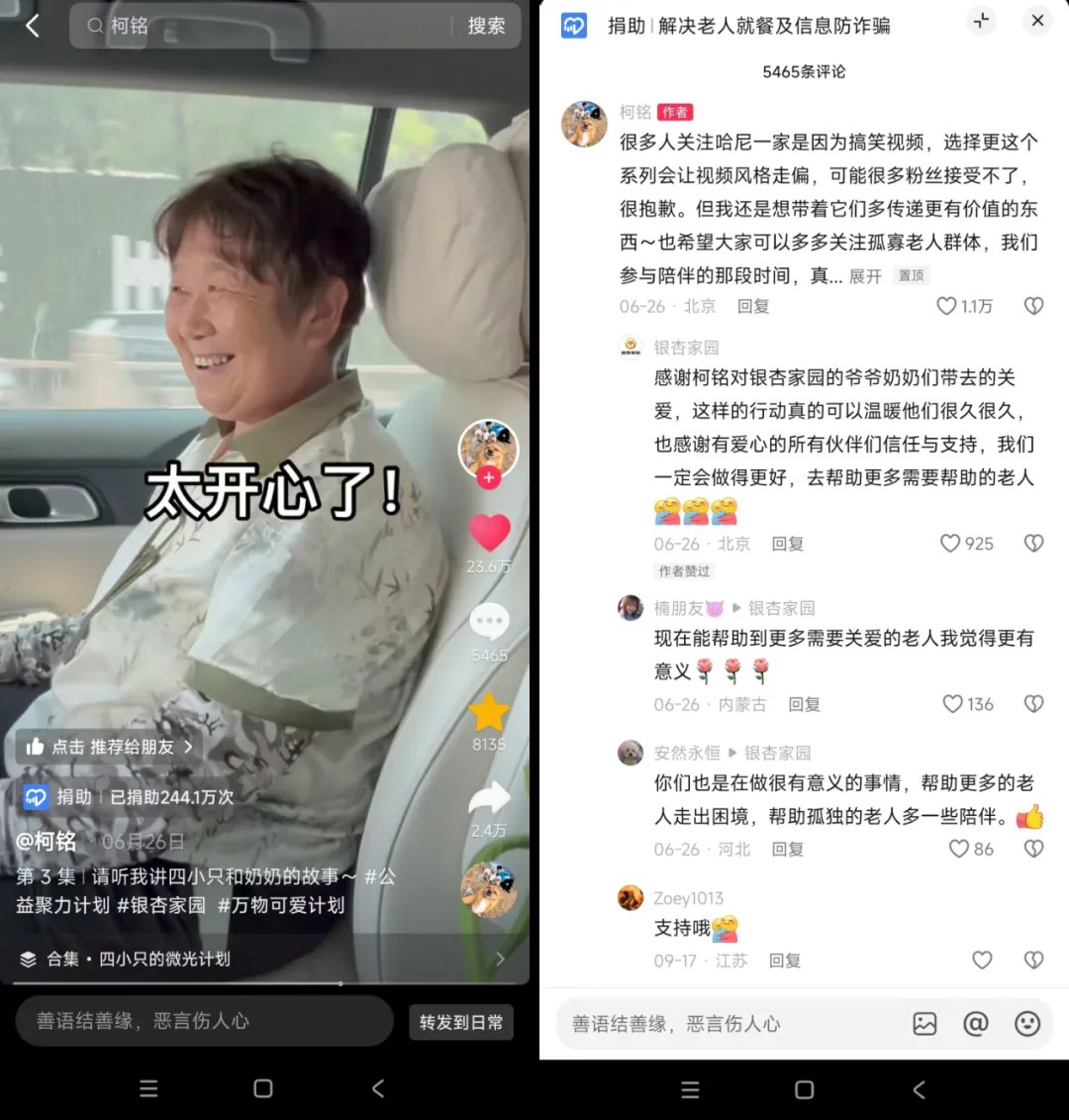 对老人来说,除了吃好饭,情感陪伴同样重要。今年6月,抖音千万粉丝创作者@柯铭 ,用视频记录下带着四小只探访一位河北农村孤寡奶奶的过程,他们陪着奶奶一起聊天、逛街、吃烤肉,让奶奶暂时忘记了那些失去孩子和丈夫时黑暗又孤独的日子,奶奶说“我已经十多年没这么开心过了”,让镜头前的网友泪目。