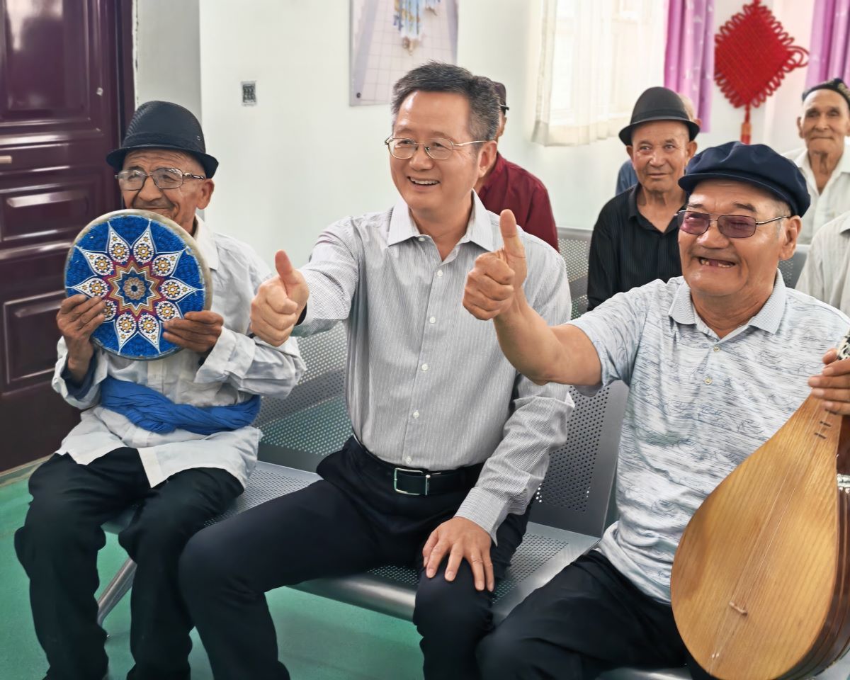 捐赠仪式结束后,詹成付理事长和都市丽人集团董事长郑耀南先生一行,与兵团民政局局长郭耀峰和兵团慈善总会会长令勇一道,走访了第三师五十一团唐驿镇颐心园综合养老服务中心和困难职工家庭代表,并为他们带去了慰问品。在养老服务中心,维吾尔族老人们弹起了冬不拉,用欢快的舞蹈表达着内心的喜悦,同时也欢迎远道而来的客人。詹成付理事长祝福老人们身体健康,晚年生活幸福快乐。在困难职工家庭,詹成付理事长送去了慰问金,并亲切勉励家中的孩子要好好学习、天天向上,用知识改变命运,成长为国家和社会的栋梁之才。