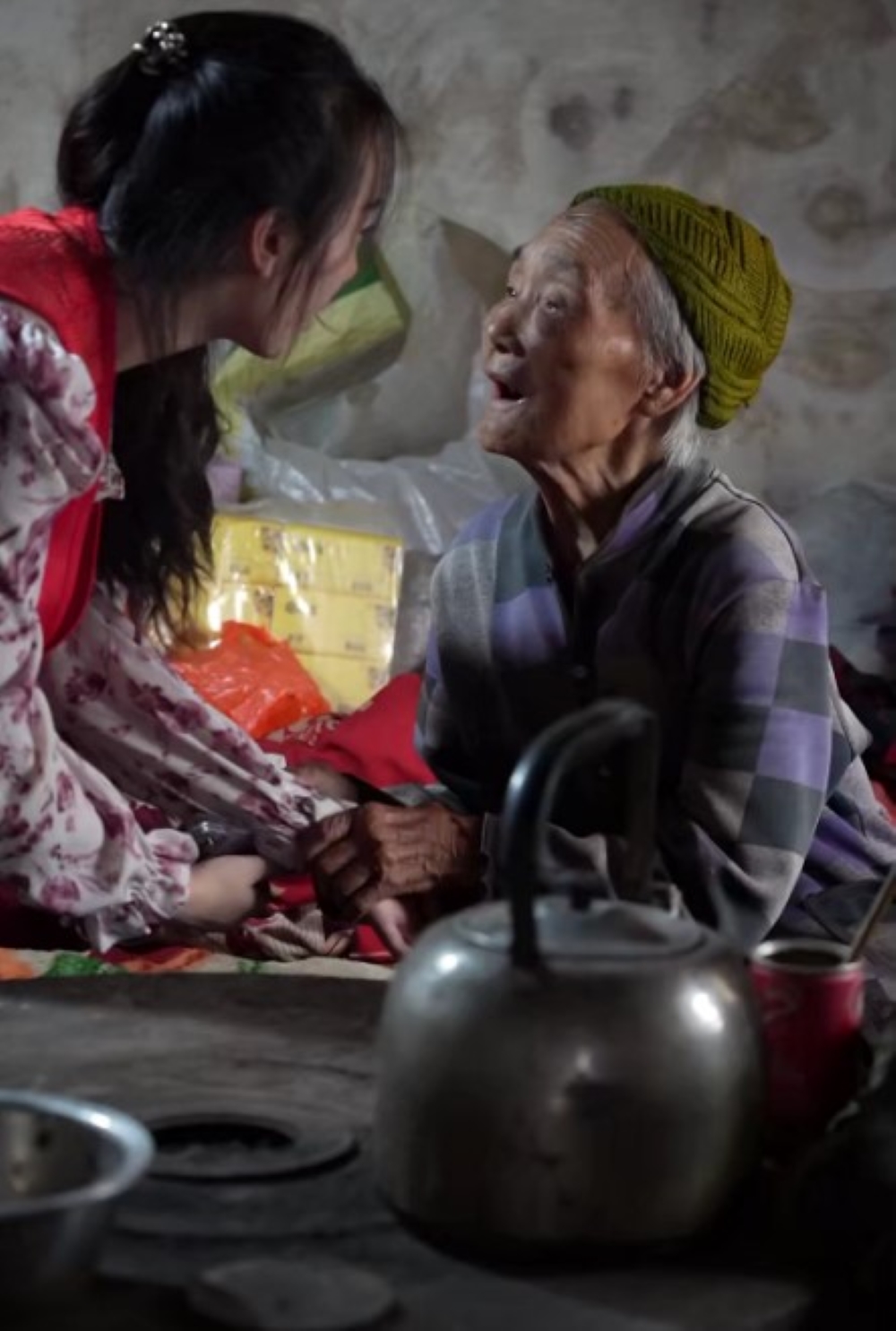 92岁的田美荣奶奶坐在昏暗的房屋里,紧紧拉着志愿者的手一遍遍说着“你们还来吗?”
