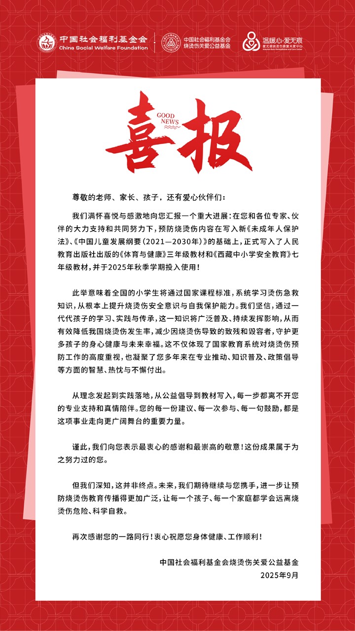 我们满怀喜悦与感激地向您汇报一个重大进展:在您和各位专家、伙伴的大力支持和共同努力下,预防烧烫伤内容在写入新《未成年人保护法》、《中国儿童发展纲要(2021—2030年)》的基础上,正式写入了人民教育出版社出版的《体育与健康》三年级教材和《西藏中小学安全教育》七年级教材,并于2025年秋季学期投入使用!