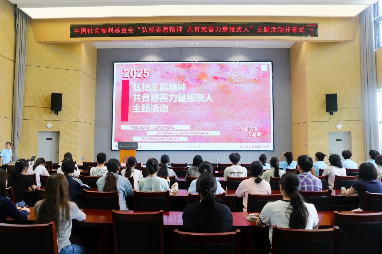 2025年9月19日,由中国社会福利基金会与重庆城市管理职业管理学院(以下简称“学院”)共同举办“弘扬志愿精神 共育慈善力量接班人”系列主题活动。我会城乡社区福利基金、中共重庆市荣昌区委社会工作部、共青团重庆市荣昌区委员会、重庆城市管理职业学院校领导、师生和新生代表共70余人参加了本次活动。