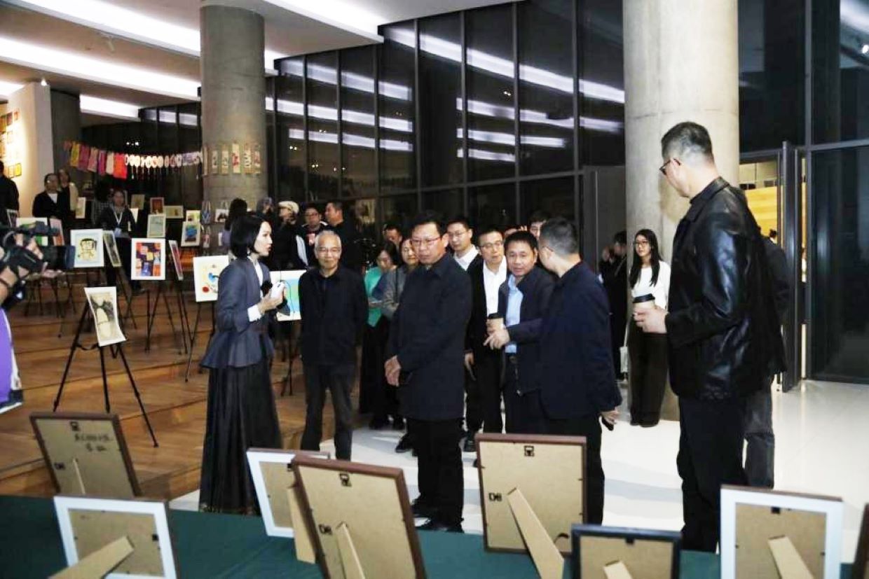 (教育部体卫艺司调研员易坤、中央美术学院校长助理潘承辉、中国社会福利基金会秘书长马中胜、中央音乐学院音乐教育学院院长张征、中国社会福利基金会授渔计划发起人高继辉、北京市美疆助学基金会理事长张月波观看学员作品)