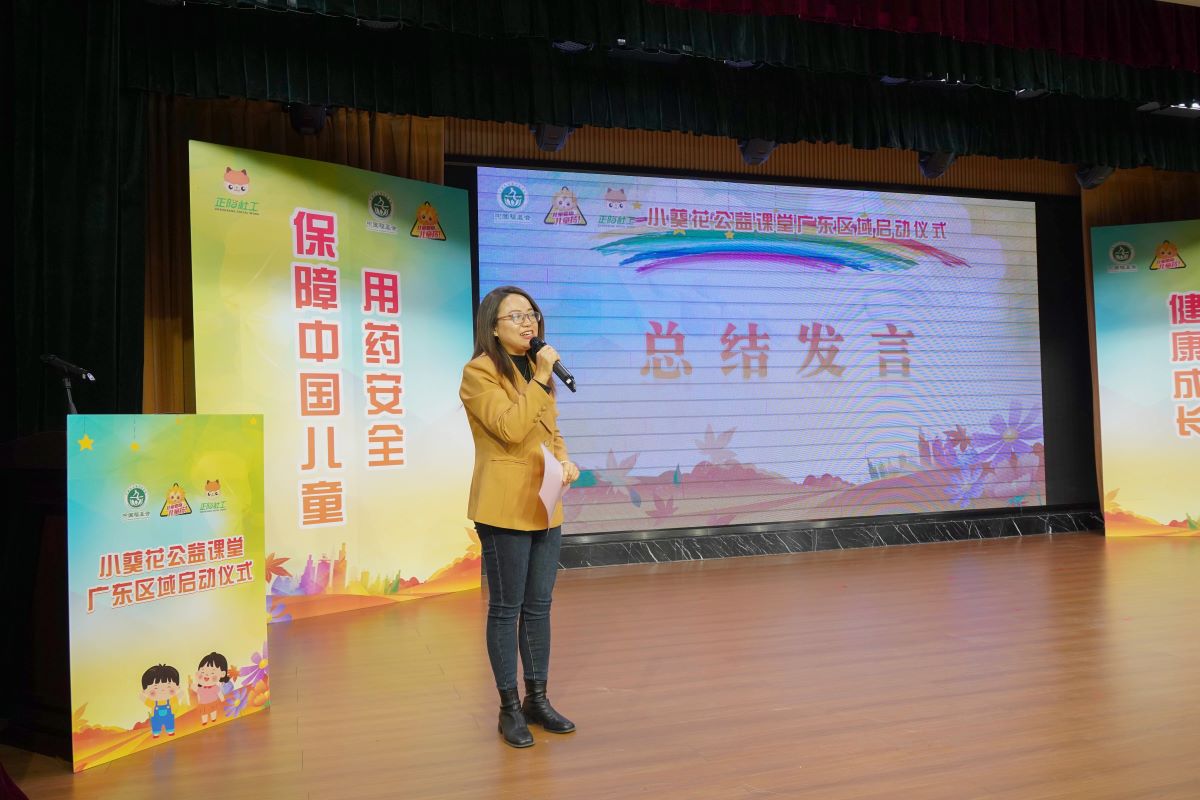 广州正阳总干事黄柳婧作总结致辞。她表示正阳社工将充分发挥专业优势,携手各方大力推进项目实施,将儿童安全用药的相关知识传递到每一个家庭。同时也呼吁社会各界共同将目光聚焦于儿童用药安全这一重要议题,让每一个孩子都在科学、安全的呵护下健康成长、向阳而生。