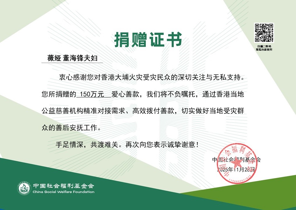 薇娅董海锋夫妇迅速响应,通过中国社会福利基金会向火灾灾区紧急捐款人民币150万元。该笔款项将专项用于受灾民众的紧急生活安置、医疗救助及后续的灾后重建工作。中国社会福利基金会对薇娅夫妇的善举表示感谢。
