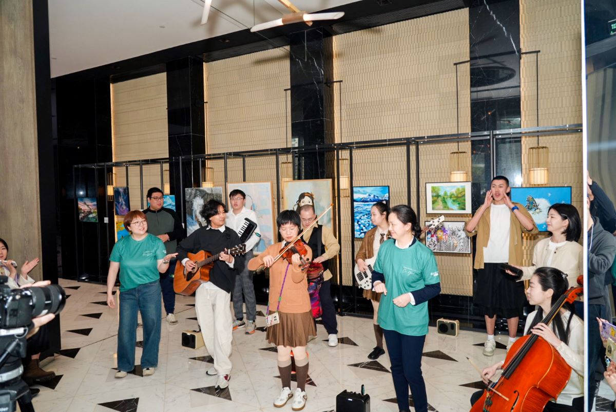 “当语言无法表达时,画笔成了他们最好的声音。” 展览现场,著名演员朱时茂先生作为神秘嘉宾与孩子们亲切互动,他真诚呼吁公众:“他们不是活在自己的世界里,他们只是用不同的方式与我们相遇。” 此外,“星光益彩”乐队的孩子们更与酒店员工同台演奏,用跨越语言障碍的音乐,让所有人见证了他们专注而闪亮的时刻。