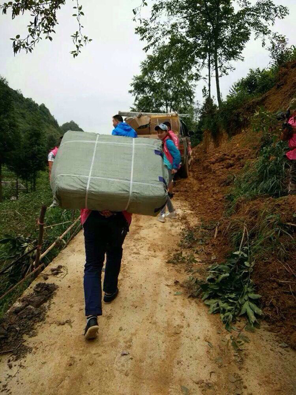 第一站是纳雍县左鸠噶苗族彝族乡岩头小学,一路都是连续几天下雨导致山体滑坡的泥巴,道路非常泥泞。滚落的巨石还挡住了大家的去路。但是双志与暖流的志愿者们一起挪开了滚石,推着车度过了泥泞难走的山路。车上不去的路,就由大家背着所有物资,坚持背完了最后一公里……