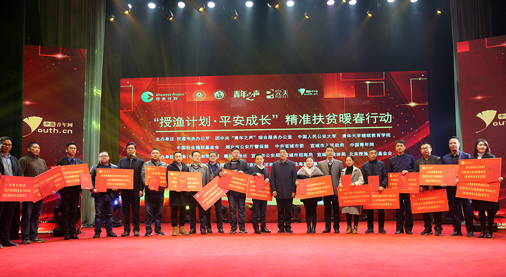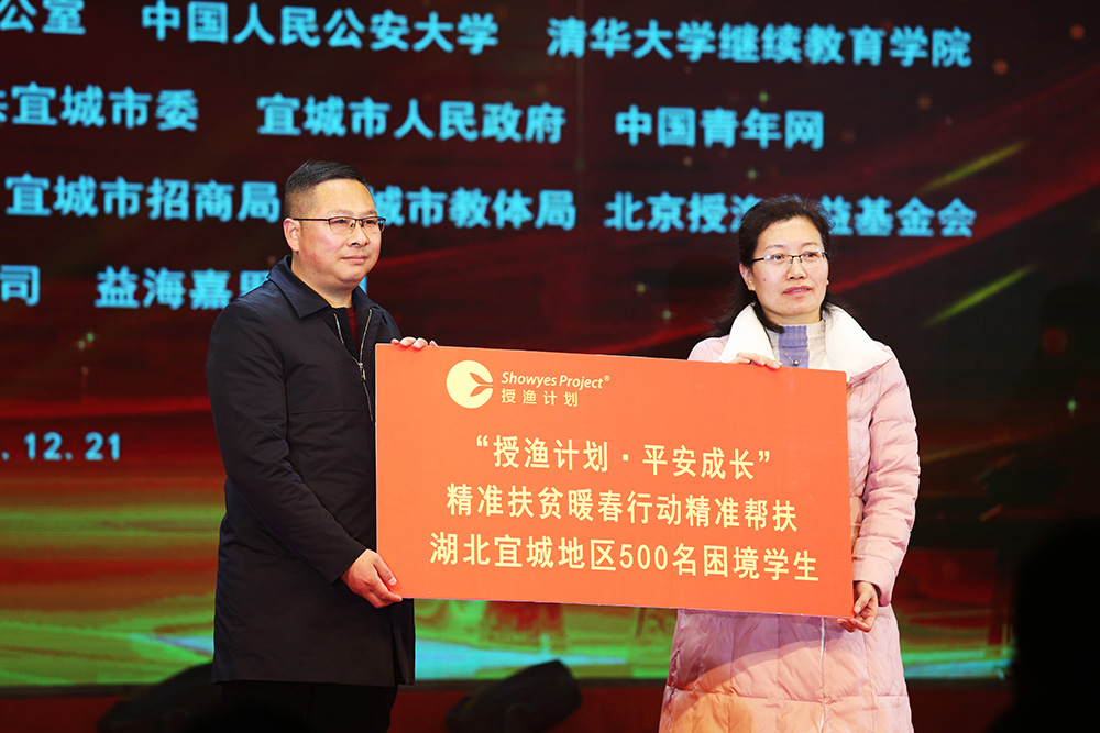 12月21日,“授渔计划•平安成长”精准扶贫暖春行动宜城公益活动在湖北省宜城市人民会堂举行。中国社会福利基金会授渔计划携手百家爱心企业捐助善款,在宜城市资助500名困境青少年学生。