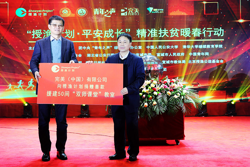 本次活动由民建中央办公厅、团中央“青年之声”综合服务办公室、中国人民公安大学、清华大学继续教育学院、中国社会福利基金会、中国青年网、湖北省公安厅警保部、襄阳日报社、中共宜城市委、宜城市人民政府等单位携手百家企业和广大爱心人士共同举办。来自全国的百余名企业家朋友、媒体朋友、各项目合作机构伙伴以及宜城市200名学生、老师代表,60名宜城公安干警代表,80名完美公司伙伴、授渔计划项目学校的老师、同学们参加了活动。