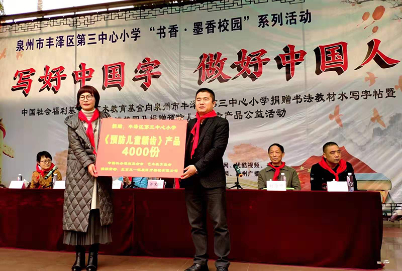 2019年3月15日,中国社会福利基金会艺术教育基金《写好中国字,做好中国人》书法进校园活动,暨预防儿童龋齿公益活动,走进了福建省泉州市丰泽区第三中心小学和丰泽区崇德实验小学。北京天一恒康医疗器械有限公司,关心民族下一代牙齿健康,给孩子们捐赠六十万人次氟化泡沫防龋齿药材。