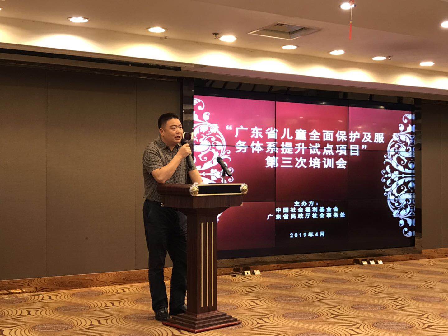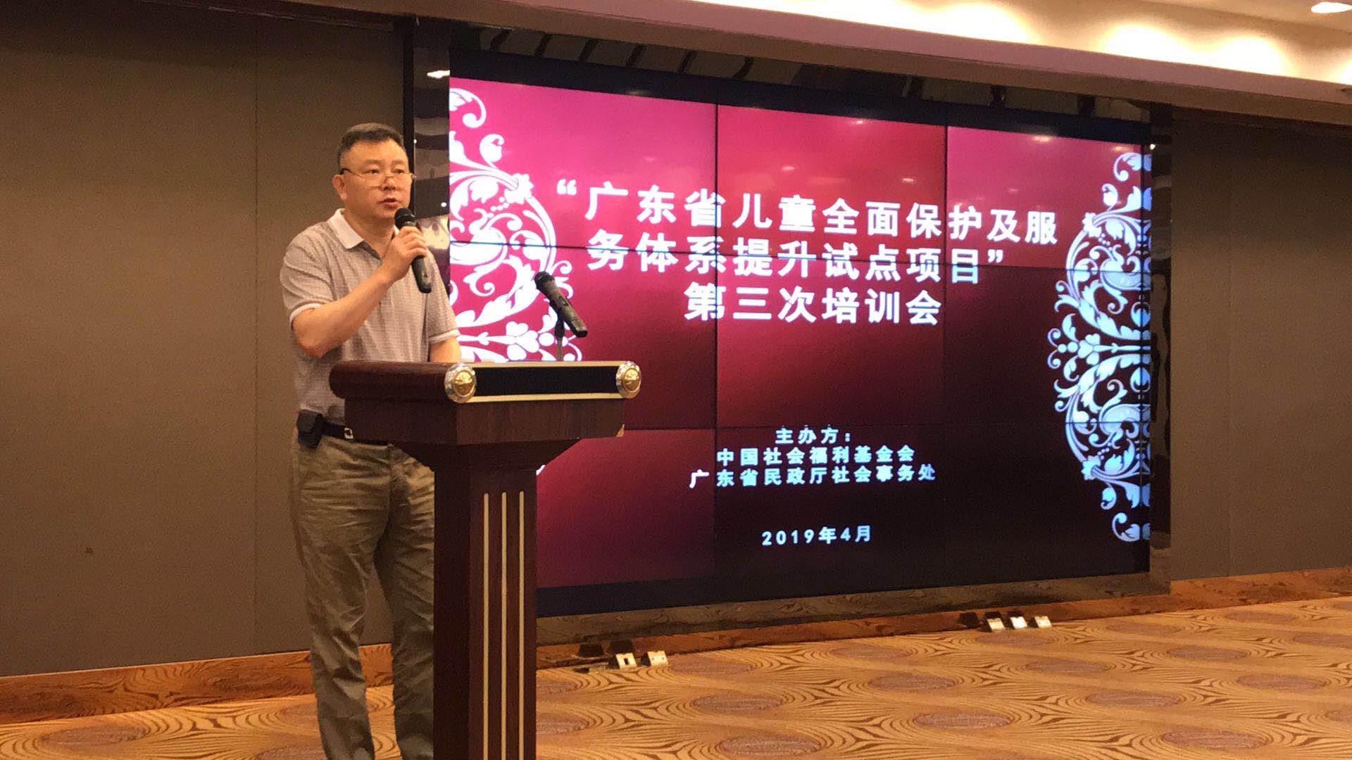 4月9日-11日,“广东省儿童全面保护及服务体系提升试点项目”(以下简称“广东惠童项目一期”)第三次培训会,在广东省佛山市三水区恒福星际酒店顺利召开。本次培训会由中国社会福利金会和广东省民政厅社会事务处主办,广东省公安厅、人民检察院未检处、妇女联合会、残疾人联合会、中国社会科学院大学社会工作学院受邀授课,广东省21个地区民政部门相关同志参加会议。省民政厅副调研员陈爱兵主持会议。