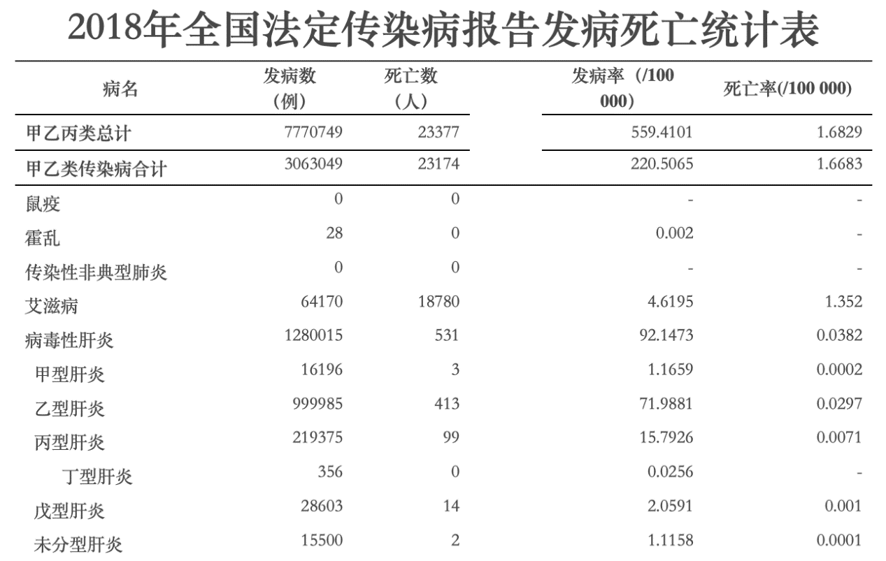 据《2018年12月全国法定传染病疫情概况》数据显示,2018年全国乙肝新发病人数为122.59万人,相比2017年增幅为21.6%。2017年中国法定传染病中,病毒性肝炎在发病人数和发病率上都高居榜首,死亡人数和死亡率高居第三。