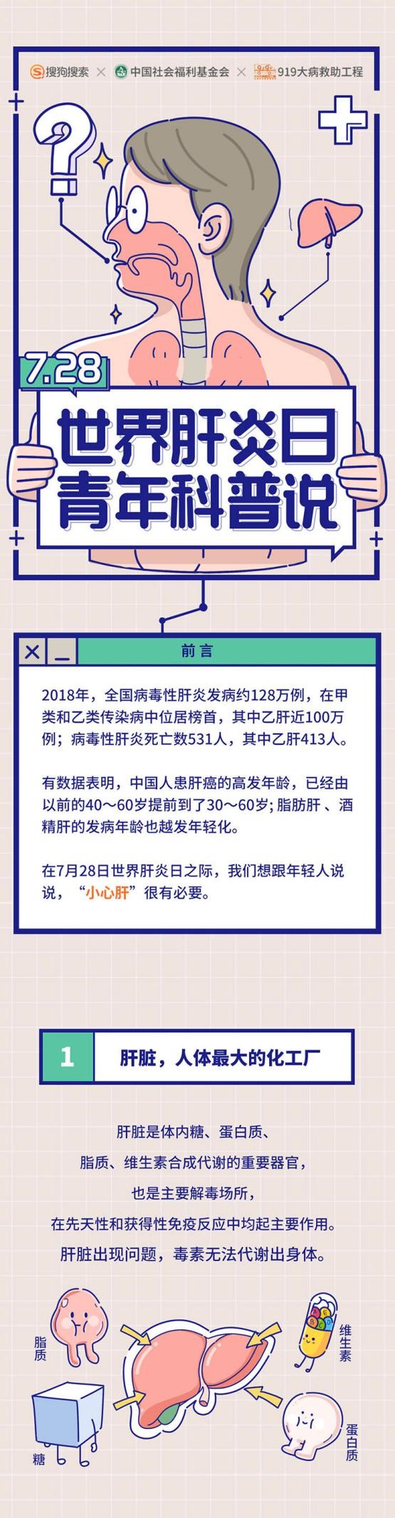 正值第九个世界肝炎日之际,正值第九个世界肝炎日之际,919大病救助工程与搜狗搜索联合发起“世界肝炎日青年科普说”项目,特邀北京协和医院肝脏外科主任医师赵海涛为年轻人量身打造《肝炎青年科普白皮书》,旨在以通俗易懂的形式,提高公众、尤其是年轻人群对于肝炎以及肝病预防的科学认知。