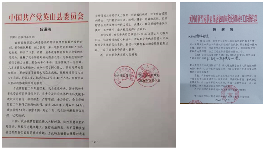 伴随中国社会福利基金的各种支援一线工作的持续开展,来自受助当地的感谢信也纷至沓来。近期,黄冈市新冠肺炎疫情防控工作指挥部、中国共产党英山县委员会及英山县人民政府,纷纷对中国社会福利基金会在抗击疫情的关键时刻,心系一线,雪中送炭的积极举措表示感谢。并表达出在万众一心、众志成城的帮扶与努力下,打赢疫情防控攻坚战的坚定信心。