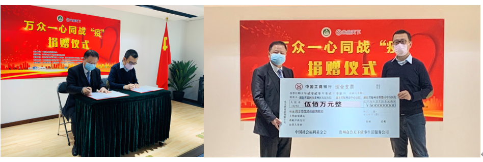 贵州众合天下债事生活服务公司向中国福利基金会捐赠500万元,支持湖北省随州市中心医院、随州市曾都区中医医院、黄冈市黄州区人民医院,用于这三家战斗在抗击新冠肺炎疫情一线的医院,急需物资的采购和改善医护人员的营养补给。捐赠仪式于2月7日上午举行,中国社会福利基金会王伏虎副秘书长代表基金会接受贵州众合天下债事生活服务公司的捐赠,并感谢企业的爱心捐赠,表示基金会尊重捐赠人的意愿,尽快将资金用到抗疫需要的地方,万众一心,共同战”疫“。