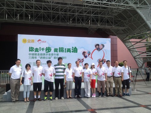 爱心携手健康,责任引领行动。2014年6月15日,“你走1千步 我捐1两油”中储粮金鼎携手中国社会福利基金会免费午餐基金三周年“透明公益”爱心中国行活动,在广州文化公园拉开帷幕,数百余名群众、公益人士、志愿者参加了活动,现场氛围热烈,引发众多市民关注。中国社会福利基金会副理事长朱朝英,基金管理部副主任齐雪英参加了此次活动。据悉,文化公园活动是“你走1千步 我捐1两油”活动的首站,意味着中储粮金鼎爱心捐赠平台的正式开放,除现场活动外,大家还可以通过微博、微信、手机客户端等方式进行爱心捐赠。该活动后续还将在武汉、南京、西安、北京等地开展,持续奉献爱心,共同传递关爱。