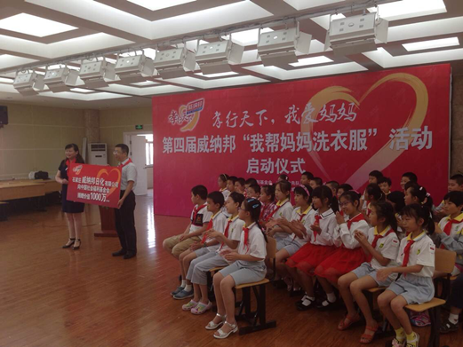 和平里四小的学生家长代表以自己的亲身经历,讲述了孩子孝敬母亲的感人故事。中国社会福利基金会高月玲副秘书长代表主办单位,首先阐明了举办活动的意义。她说,举办这一活动是为了引导广大少年儿童,学会从小事做起,从身边做起,自己的事情自己做,培养行孝意识,弘扬“百善孝为先”的传统美德,她高度赞扬及感谢石家庄威纳邦日化有限公司这种奉献爱心、回报社会的崇高善举。启动仪式上,该公司于秀丽副总经理向中国社会福利基金会辅导员公益基金捐赠了价值1000万元的洗衣用品,中国少先队事业发展中心党组书记、主任李文革同志,代表主办单位接受了捐赠。为了号召更多的小朋友参加活动中来,四(2)中队的孙曼迪同学代表队员们宣读了活动倡议书。