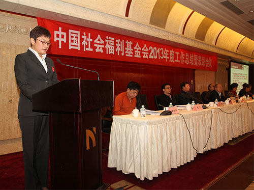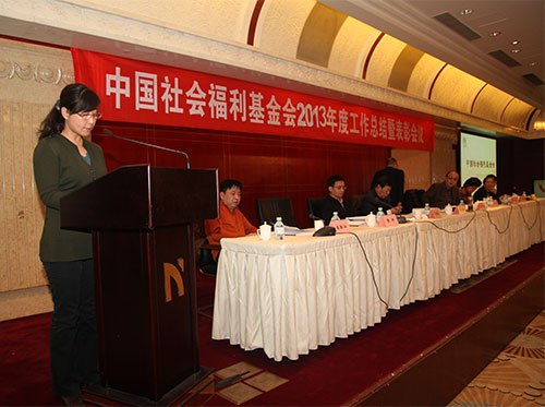 2014年3月13日,中国社会福利基金会2013年度工作总结暨表彰会议在京召开。基金会顾问、理事长、副理事长(秘书长),各理事、监事,基金会副秘书长,基金会各部门主任、副主任,各分支机构、专项基金、公益项目管委会执行主任(或秘书长)和财务人员140多人出席会议,基金会各部门工作人员列席会议。民间组织管理局副局长贾晓九应邀参加会议。