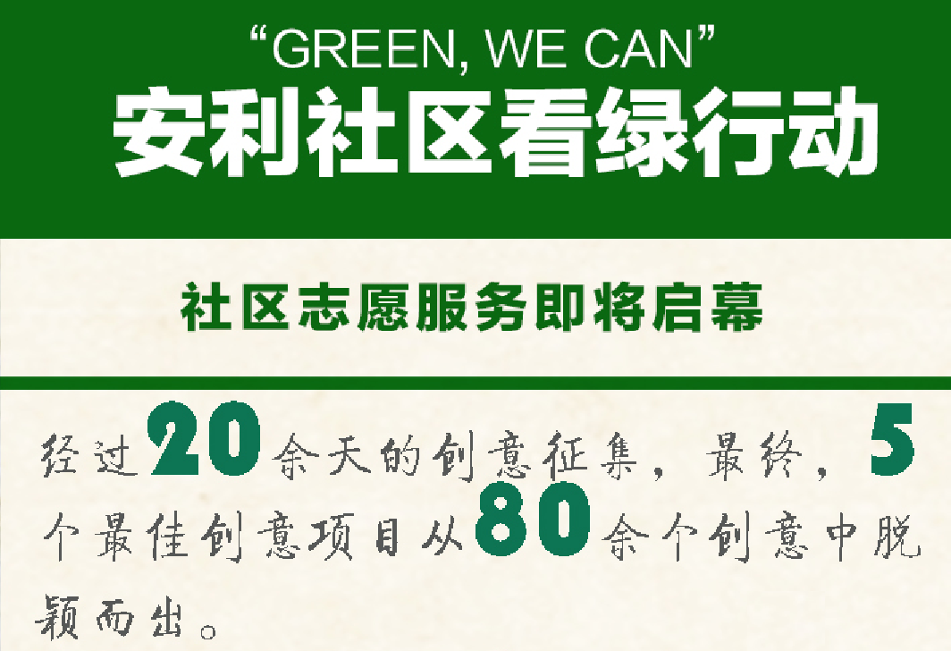 “GREEN, WE CAN!”项目在中国社会福利基金会社区发展基金官网建立征集票选平台后,经过20余天的项目征集和评选,5个草根创意项目最终被安利志愿服务队认领,在接下来的两个月中,创意项目将陆续进入全国近20个城市的30余个社区。具体落地城市及时间安排,请关注项目官方网站(http://acsc.org.cn/greenwecan/)和微博@安利看绿行动。