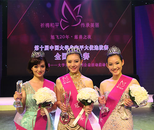 比赛中,来自中国传媒大学、浙江大学、外交学院、西南大学等17所高校的44名优秀女大学生,通过青春活力装、学士服、民族服饰、环保主题服装以及晚装等环节的激烈角逐,最终,中国传媒大学吴梦瑶、李祎璇分别获得了冠、亚军,浙江大学赵雪荣获季军。本届活动的冠、亚、季军将于2014年1月代表中国前往韩国参加第27届世界大学生和平大使选拔赛总决赛。