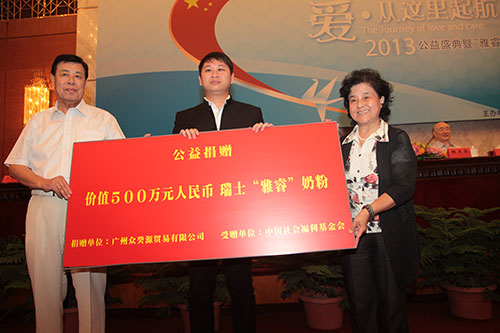 2013年8月29日上午“爱,从这里起航”2013公益盛典暨“雅睿”慈善系列活动的启动仪式在人民大会堂新闻厅举行,本次启动大会由中国社会福利基金会主办,中国社会经济调查研究中心区域经济研究所、中国环境新闻工作者协会舆情服务中心、中经城市发展研究中心等单位协办,广州众癸源贸易有限公司承办,十届全国人大副委员长、全国关心下一代工作委员会主任顾秀莲等领导同志出席了公益活动启动仪式。