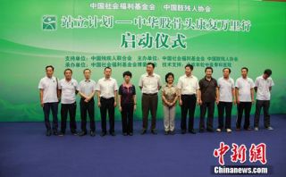 “站立计划”活动主办方嘉宾与受助患者合影。主办方嘉宾启动“水晶球”。 中新网北京8月27日电(杜雯雯) 26日,由中国社会福利基金会、...