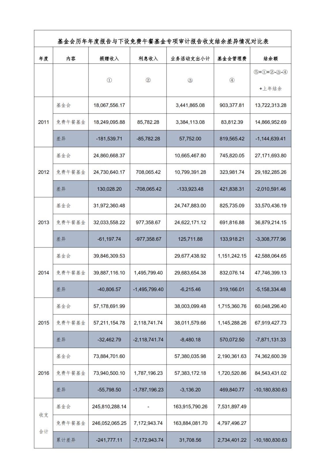 审计表明, 由于收支统计和披露口径不一致,基金会2016年度审计报告与下设免费午餐基金专项审计报告披露的免费午餐基金收支、结余数据均存在差异。截至2016年末,基金会年度审计报告中免费午餐基金结余比免费午餐基金年度财务收支专项审计报告结余少10,180,830.63元。经对比,差异形成于2011年至2016年,其中:捐赠收入少241,777.11元、利息收入少7,172,943.74元、业务活动支出多31,708.56元、管理费多2,734,401.22元。