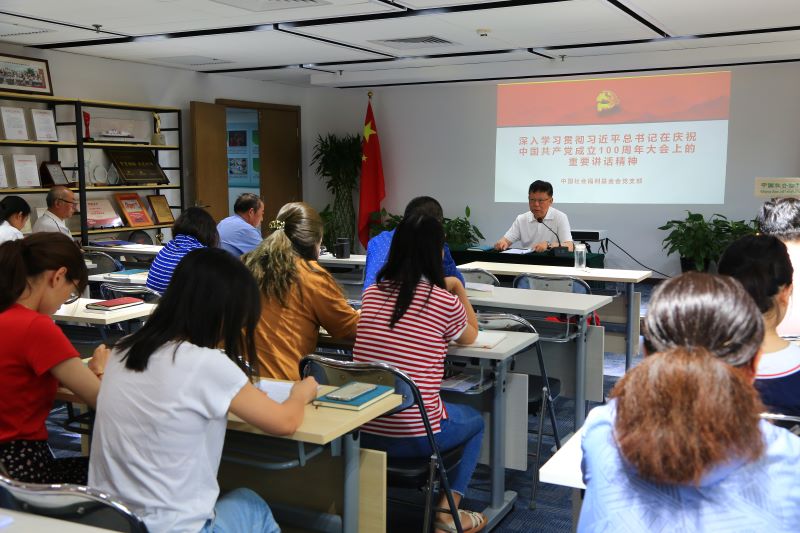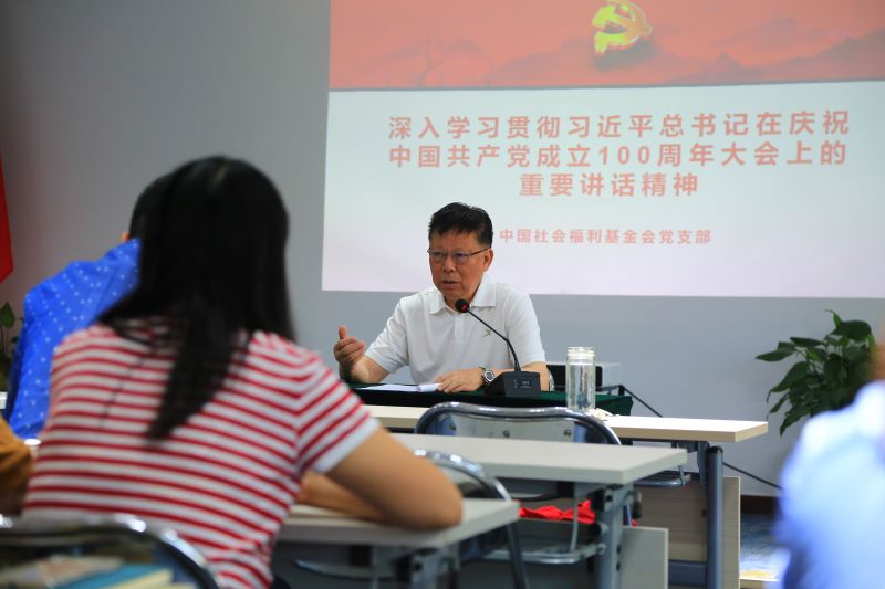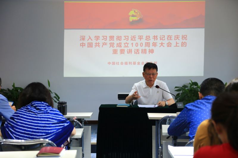 戚学森结合民政部党组成员、副部长詹成付同志新近撰写的《新时代新征程中国版的<共产党宣言>——学习习近平总书记在庆祝中国共产党成立100周年大会上重要讲话精神的体会》一文,结合民政工作、社会组织工作的责任与初心,向全体党员和员工谈深入学习“七一”重要讲话的重大现实意义和深远历史意义;谈联系思想和工作实际深入学习实践的重点、要点,对下半年继续做好“学党史、悟思想、办实事、开新局”工作进行部署。